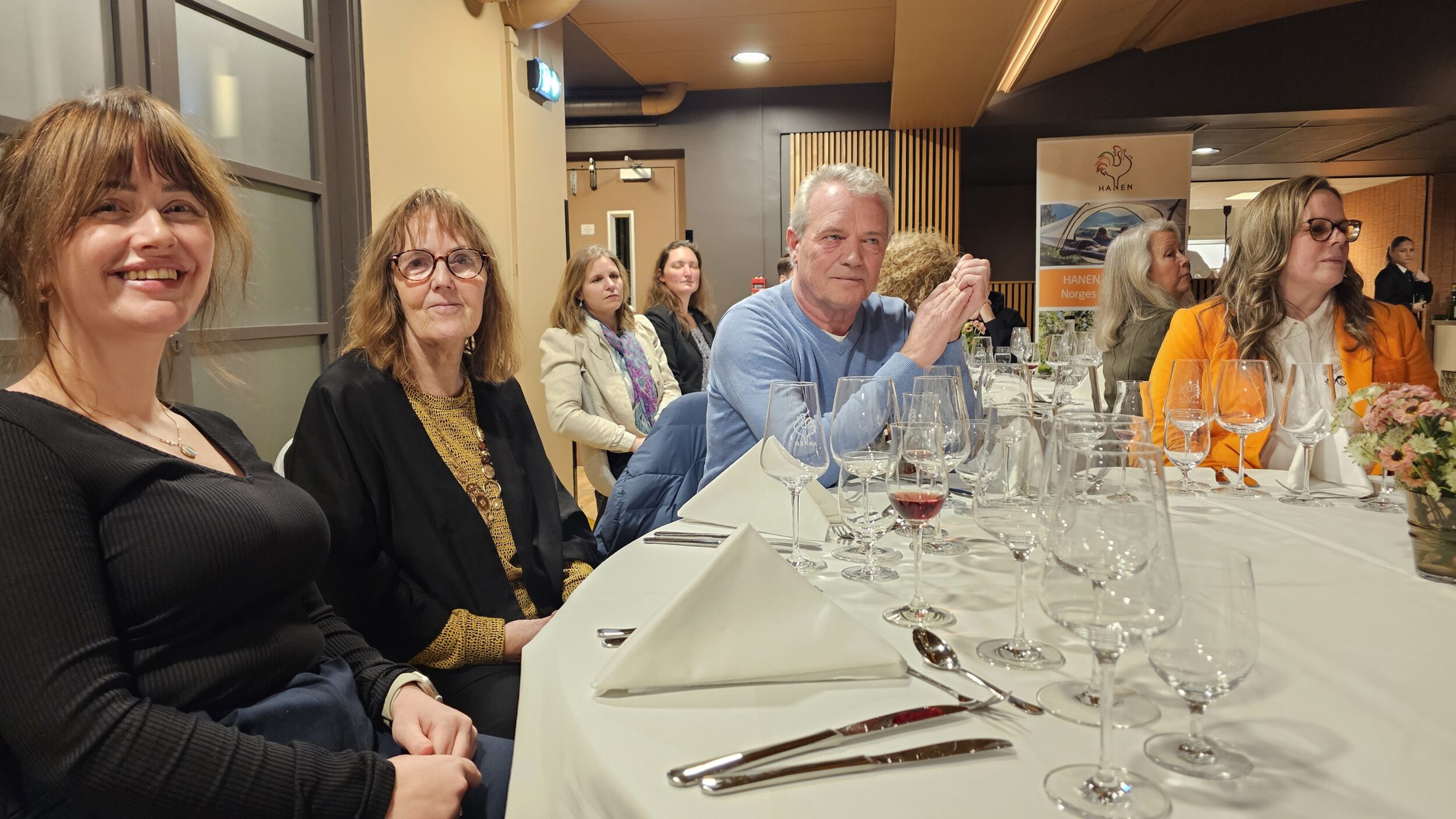 Bildene fra v. Anta Reinertsen Årets birøkter, med juryleder Benedicte Myhre. Midten: Tara Reinertsen (barnebarn), Anita Reinertsen og birøkter Tor Øvrum, og andre gjester ved festmiddagen. Til h. Einar Johansen, Fremtidens birøkter 2025.