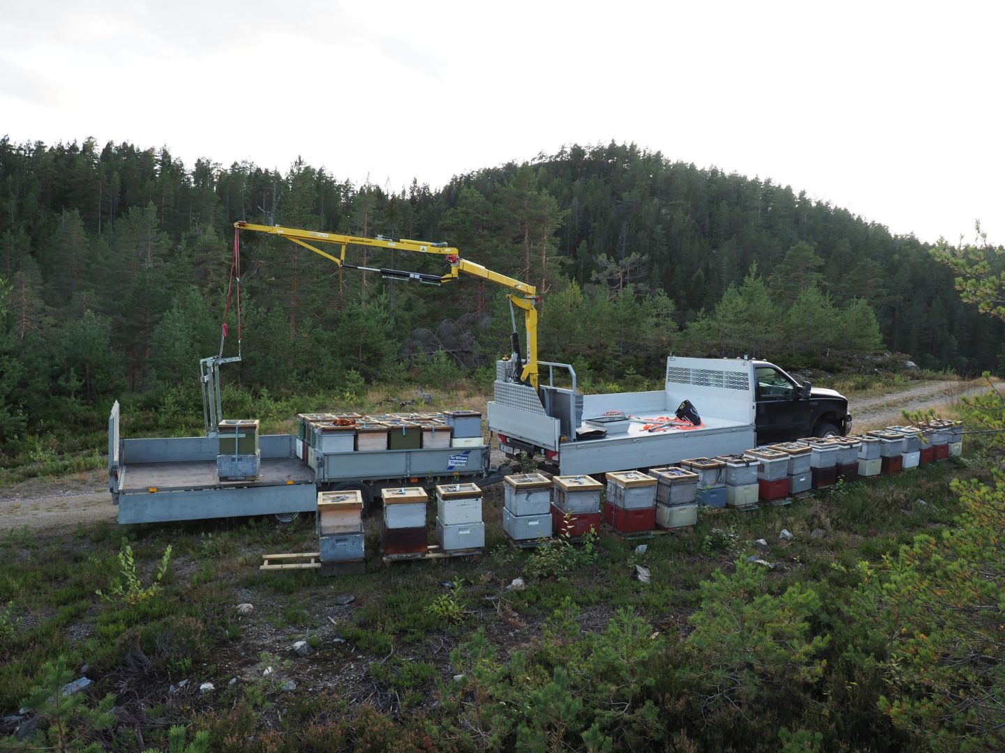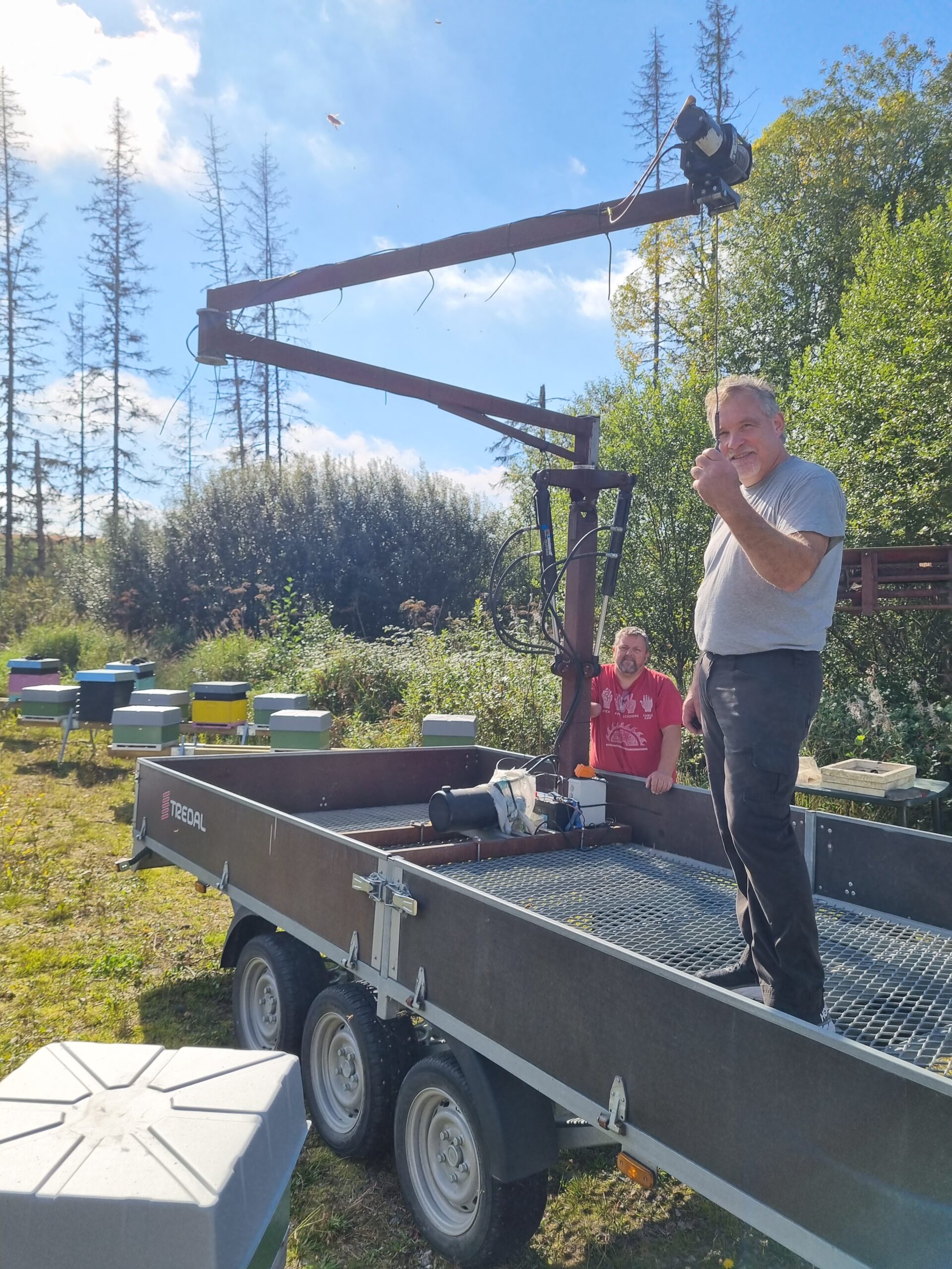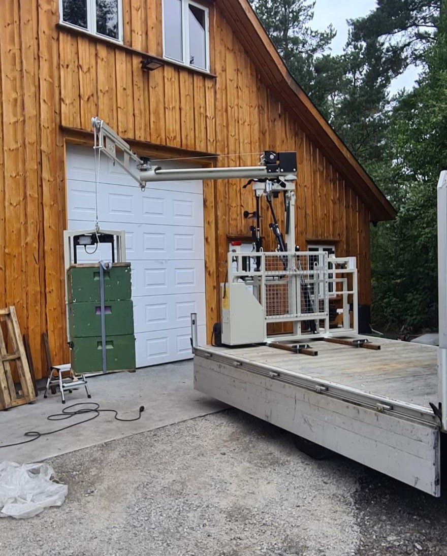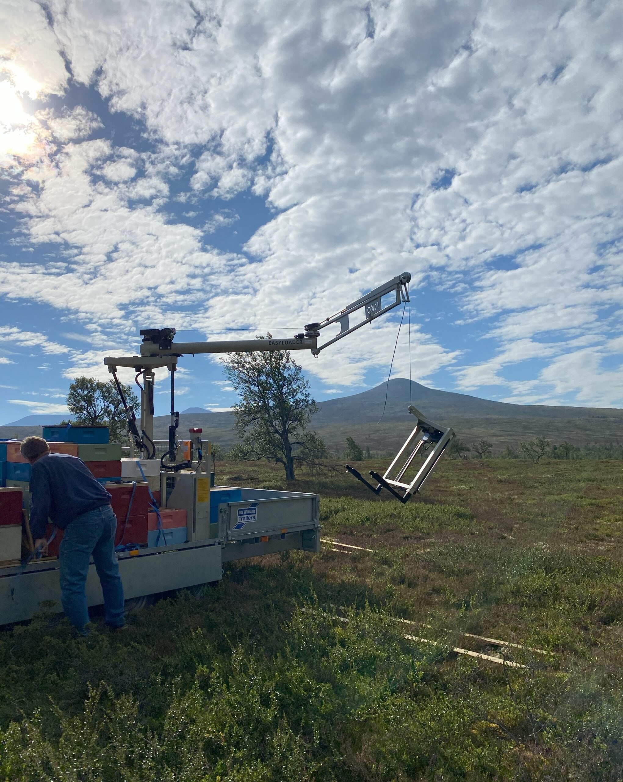 Midten: Alexander Du Rietz i Oppland har montert den på en Williams henger, der han får plass til 40 kuber. Krana kosta 200.000,- + mva i 2022, montering kommer i tillegg. Klaffene på gripeanordningen fester seg sikkert inn i bærehåndtakene på kassene, og man kan løfte hele kuben ved høsting eller vandring, eller kun løfte skattekasser for sjekk av yngelrommet.