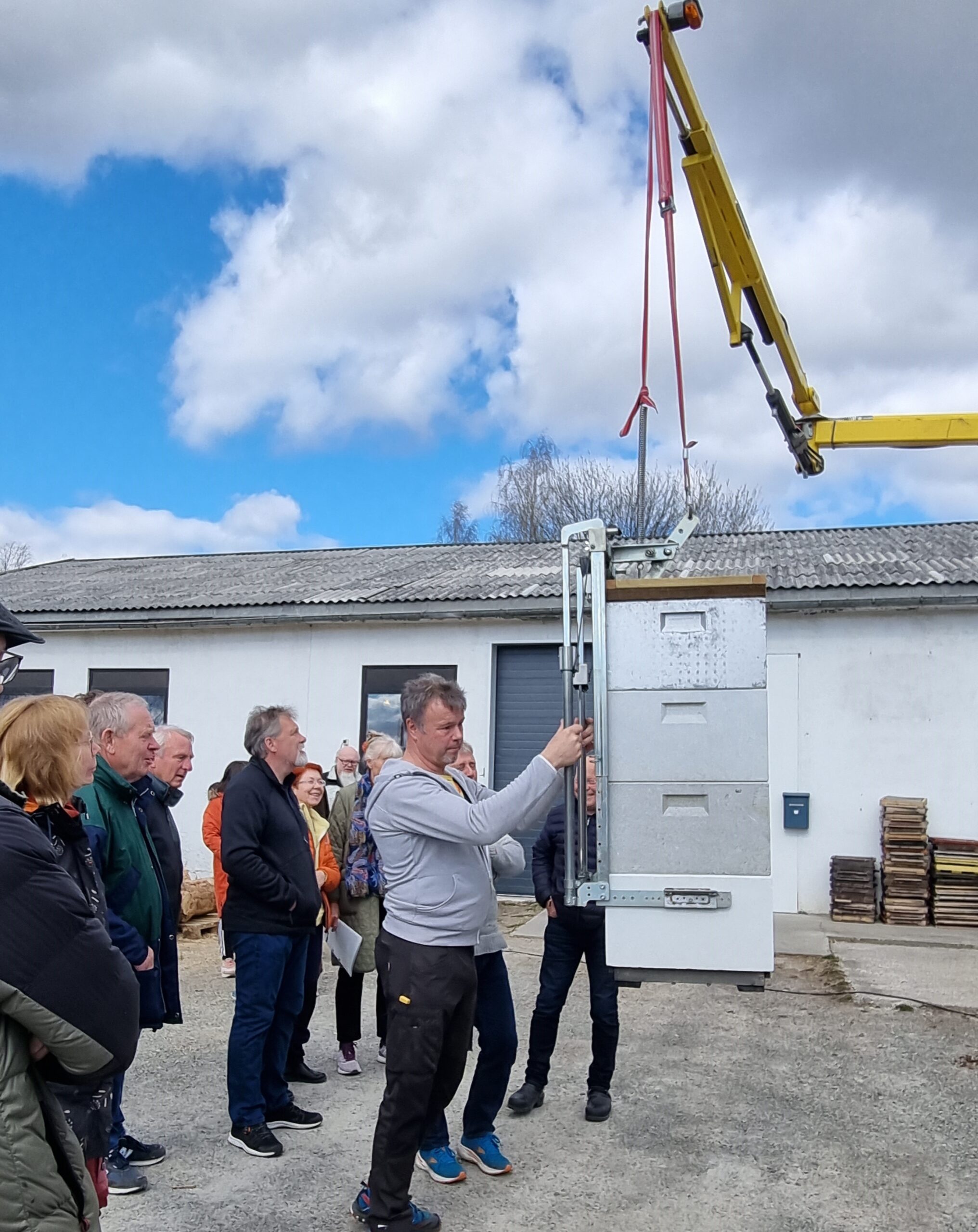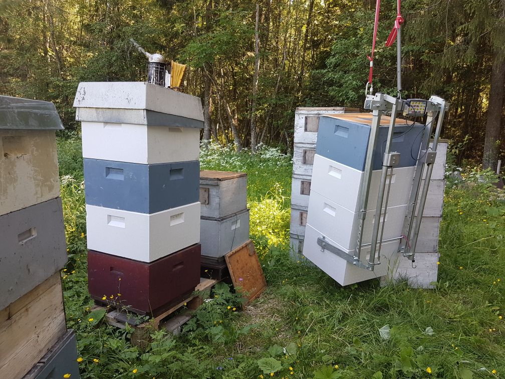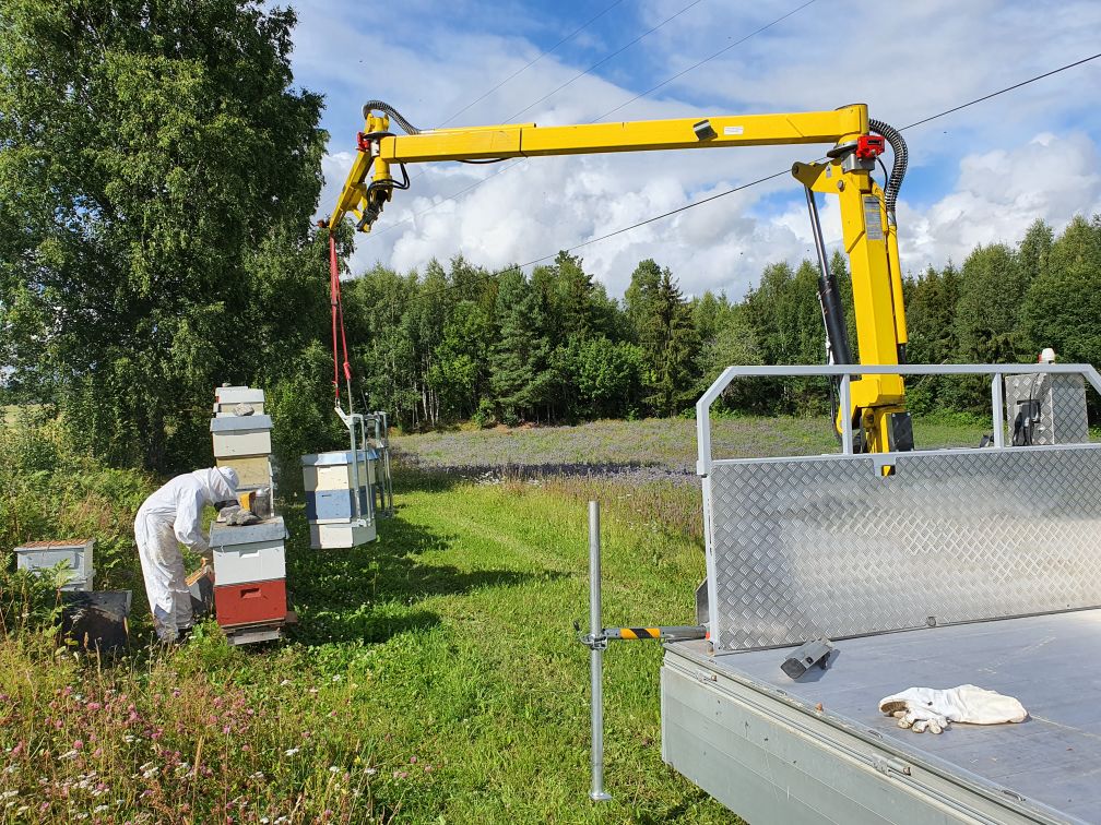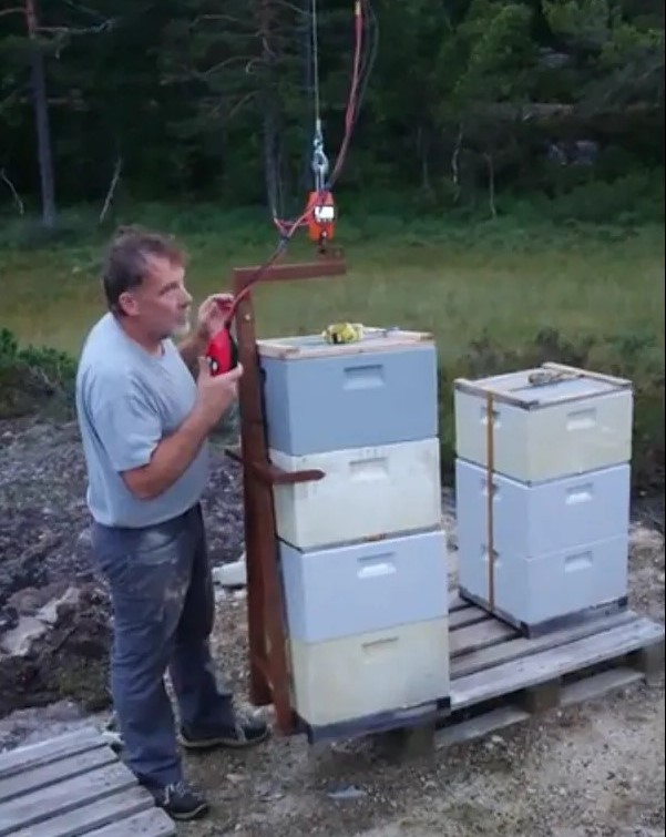 Til høyre: Gripeanordningen gjør krana egnet både ved sjekk av yngelrom under tunge skattekasser, når han skal sette på bitømmerbrett ved høsting, og ikke minst til vandringa. Han sier selv at innimellom blir han fristet til å bare «bråkaste på» noen kuber på bilen, men angrer seg raskt; den tiden det tar å få i gang krana er vel anvendt tid dersom han vil beholde helsa.