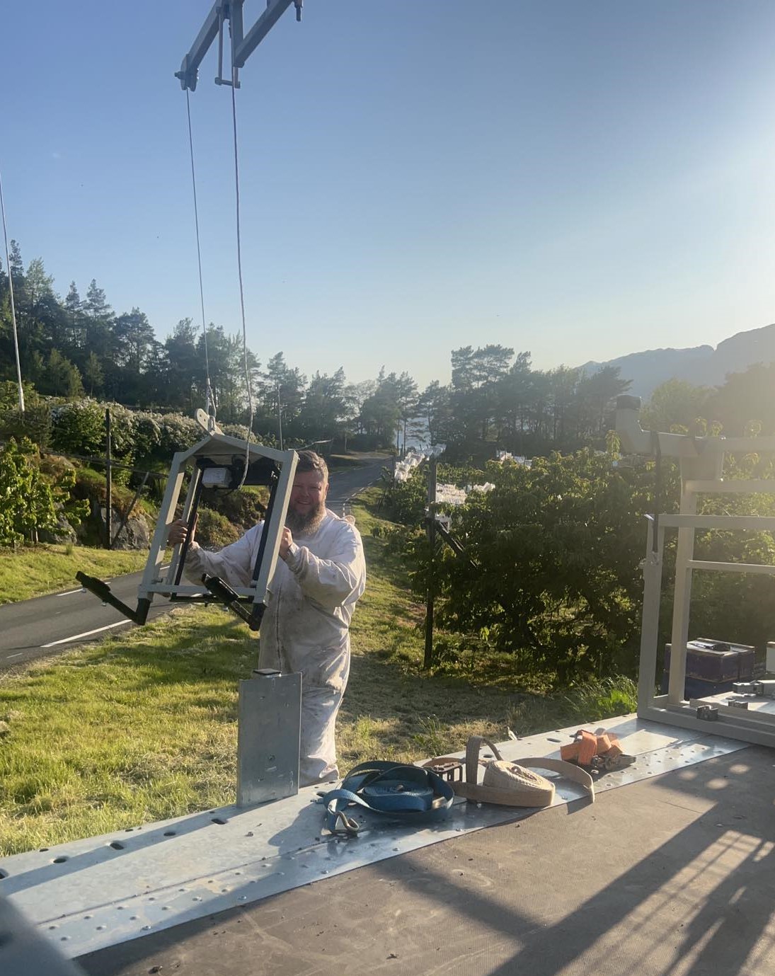 Til høyre: I Bergen har Vegard Helland montert den på Brian James Trailers. Hengeren er kun 2 meter bred og 5 meter lang, altså ganske smal, men ifølge Helland nydelig å kjøre på vestlandsveier på pollineringsoppdrag. Får plass til 4 kuber i bredden, og med hans bil kan han laste på 1300 kilo.