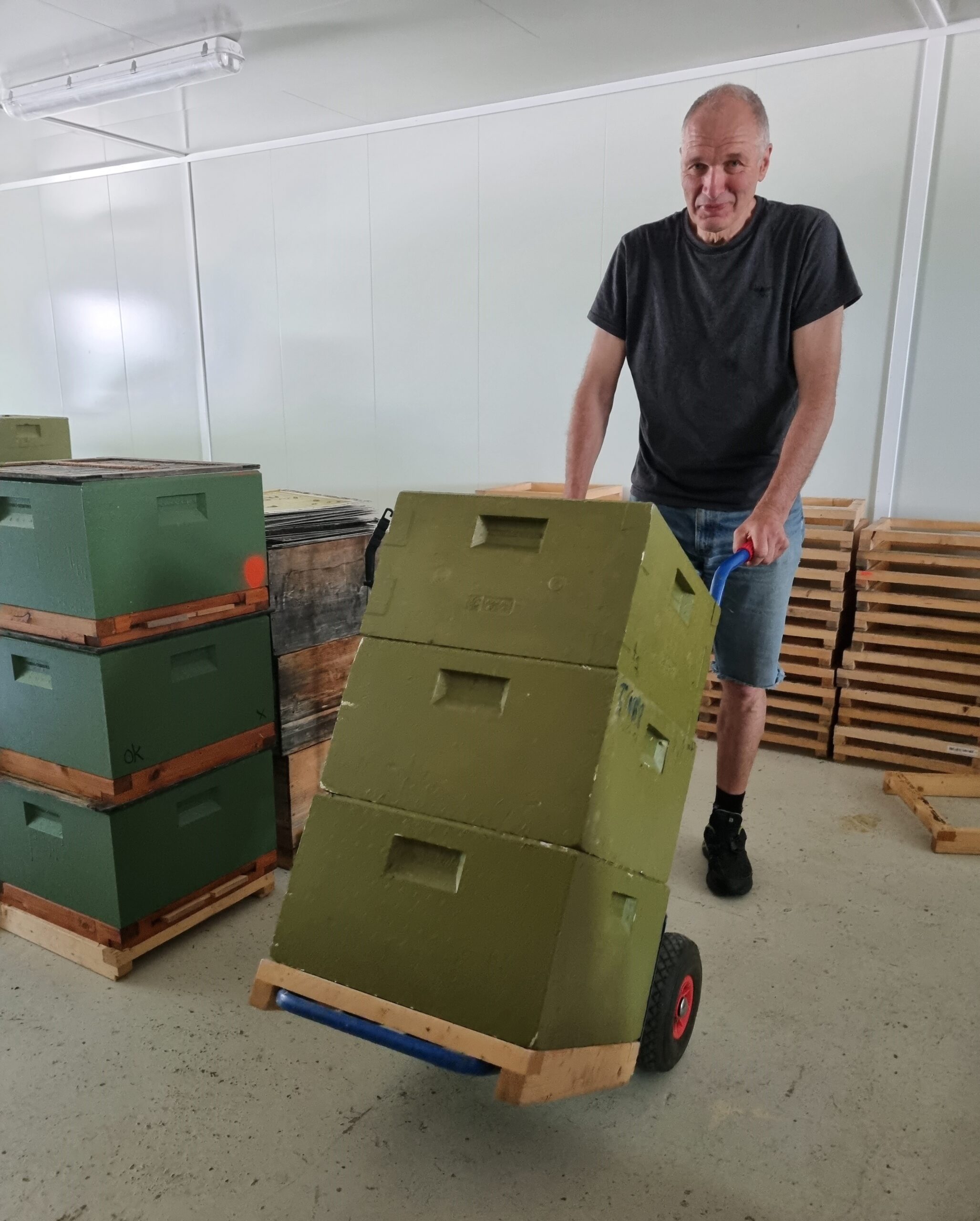 Bilde til v.: Peter Rieber-Mohn i Telemark kjøpte tralla på Biltema i sin tid, de selges enda til rundt tusenlappen. Alt utstyret hans står i stabler på egenproduserte rammer som sikrer lufting (i bakgrunnen) og blir flyttet mellom tørkerom, slyngrom og lager med tralla. Han har også modifisert ei tralle ved å flytte klaffen opp slik at den akkurat går innunder en kubekrakk. Den brukes for å flytte tunge kuber i bigården. Har en skaphenger som kubene trilles inn på.