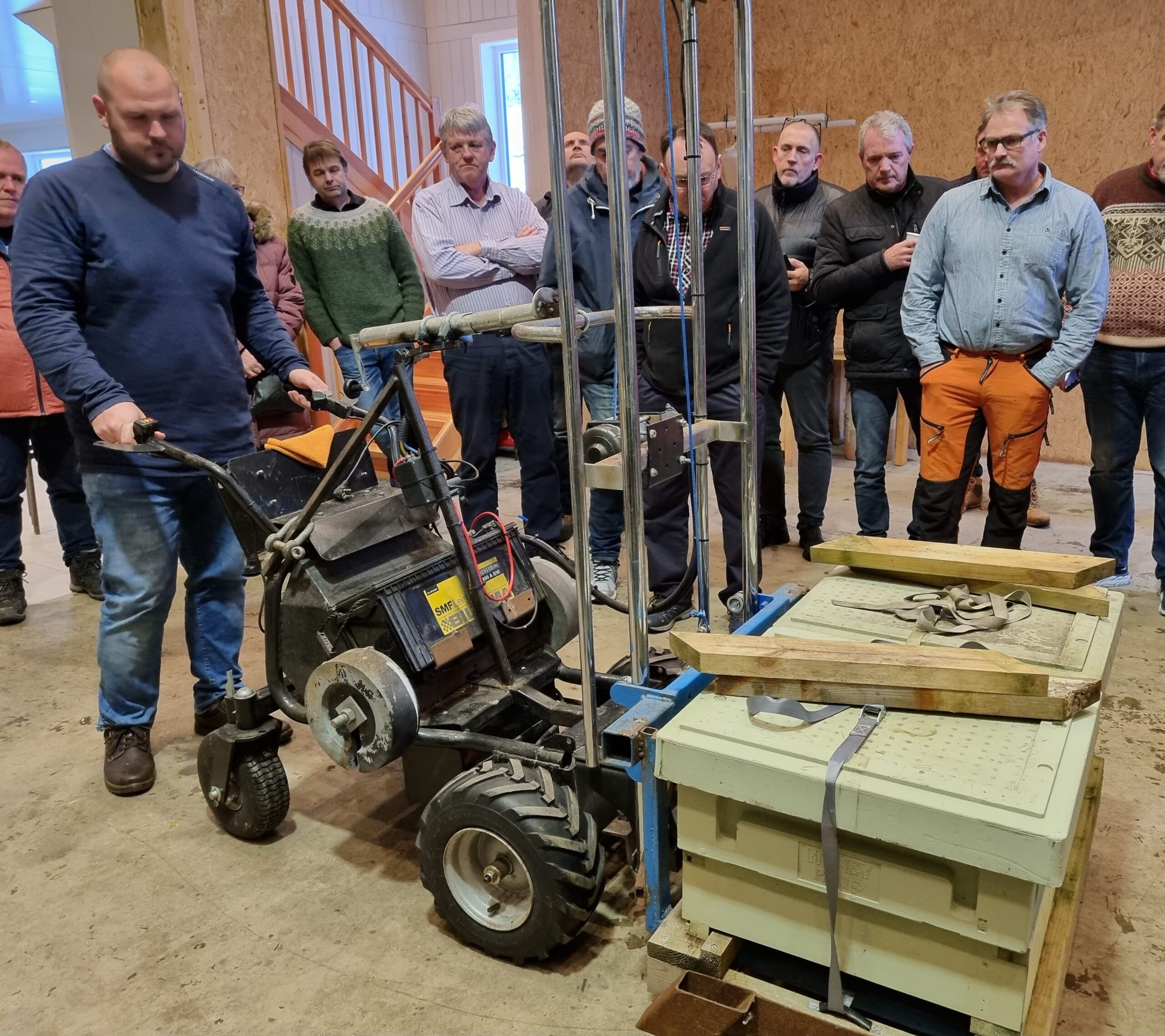 Over, til h.: I Grimstad går også en egenprodusert elektrisk terrenggående 4 hjuls truck, med løftekapasitet på 120 kg og løftehøyde ca 1,5 meter. Sigmund Treldal viser den fram til en nysgjerrig gruppe, og forteller at den fungerer bra til flytting av kuber på bæresvak grunn, der den brukes sammen med liten lastebil eller tilhenger og kjørebruer. Men det rister og går langsomt ute i terrenget. Denne løfter kubepaller med 2 kuber på. Pris ca 40.000,- + egeninnsats ved modifisering.