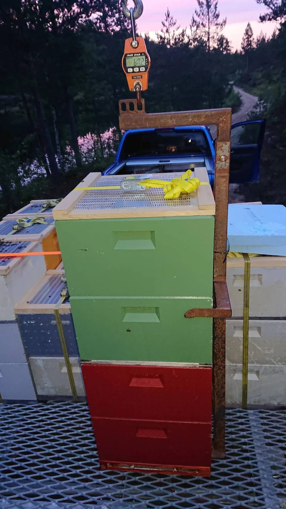 Midten: Krana er påmontert en egenprodusert pallegaffel til å løfte tilpassede kubepaller. Familien Treldal/Lia forteller at den løsningen fungerer topp til vandring og andre tyngre transportoppgaver i birøkten.
