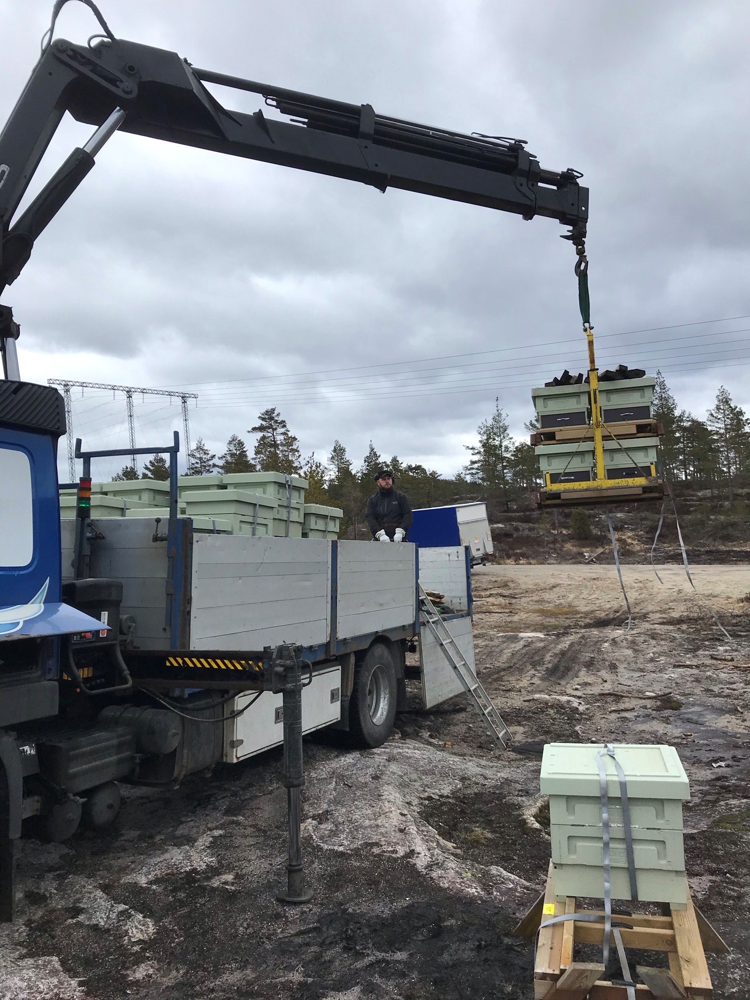 Over til v.: I Grimstad brukes en lastebil (Volvo Fm 7) med en Hiab fjernstyrt kran med 13 meter rekkevidde. Lasteplan er 2,5 x 6,5 meter, har kapasitet på 80-100 kuber pr lass. En gammel kranbil fås i alle prisklasser fra ca 100.000,- og oppover, men det krever modifisering for å tilpasses birøkterutstyret. Og ikke minst må man ha sertifikat for både lastebil og kran, og kranbilen er underlagt årlig EU kontroll, med de ekstra kostnadene det medfører.